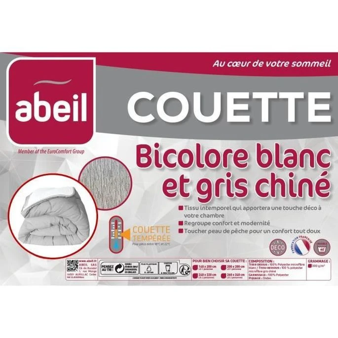 ABEIL Couette Tempérée BICOLORE 200x200cm – Blanc & Gris Chiné